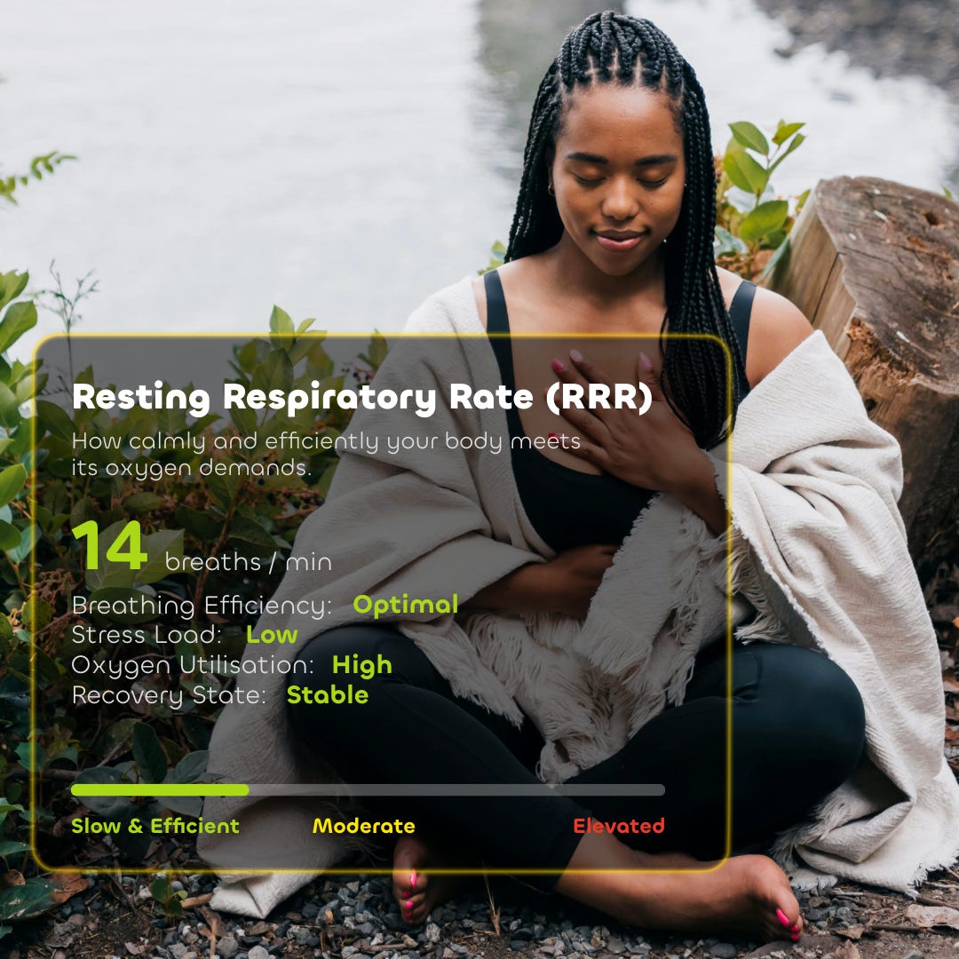If you’re familiar with the dashboard of your car, you will rate to this analogy. If your heart rate is the engine's RPM, your Resting Respiratory Rate is the idle speed. If you’re red-lining while sitting at your desk, you’re burning fuel you’ll need later.